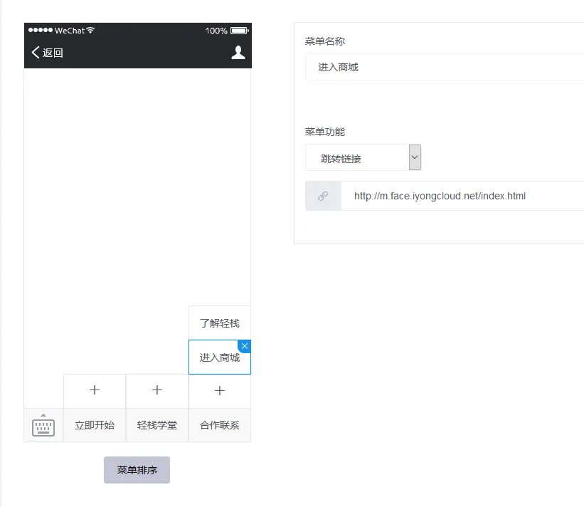 发布闪售小程序商城 ![]() 然后进入公众号平台设置公众号菜单,填写商品链接,这样就能从公众号菜单栏进入单商品小程序了。 商品生成二维码,可以分享给微信好友,分享好群聊,朋友圈。 编辑商城页面保存直接生成商城链接 ![]() 这样就生成PC端商城,手机官网商城 ![]() 设置公众号菜单跳转商城,就是微信商城。 ![]() 公众号菜单跳转小程序商城,微信小程序商城。 ![]() 除了公众号菜单,还有公众号自动回复,关注回复,定时回复,关键词触发回复 ![]() 可以把公众号授权到智慧链接,进行公众号管理,设置子菜单跳转微信小程序商城 ![]() 跳转手机官网商城,跳转微信小程序商城快速设置。 自己搭建的商城,无需担心售后问题,自己登陆轻栈平台,简单操作就能不断更新自己的微信商城,并且支持实时动态修改。自己维护,降低沟通成本,沟通时间,降低售后成本。 如果不会操作,还能在轻栈社区发帖提问,解决操作问题。还有系列教程,根据教程能够快速搭建微信商城。 下一页:自己怎么在微信小程序开店呢?