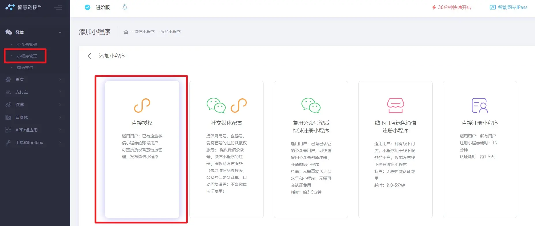 没关系,只要授权到第三方开发平台进行管理就能继续,进入轻栈【智慧链接】管理小程序,选择直接授权,扫码同意即可。