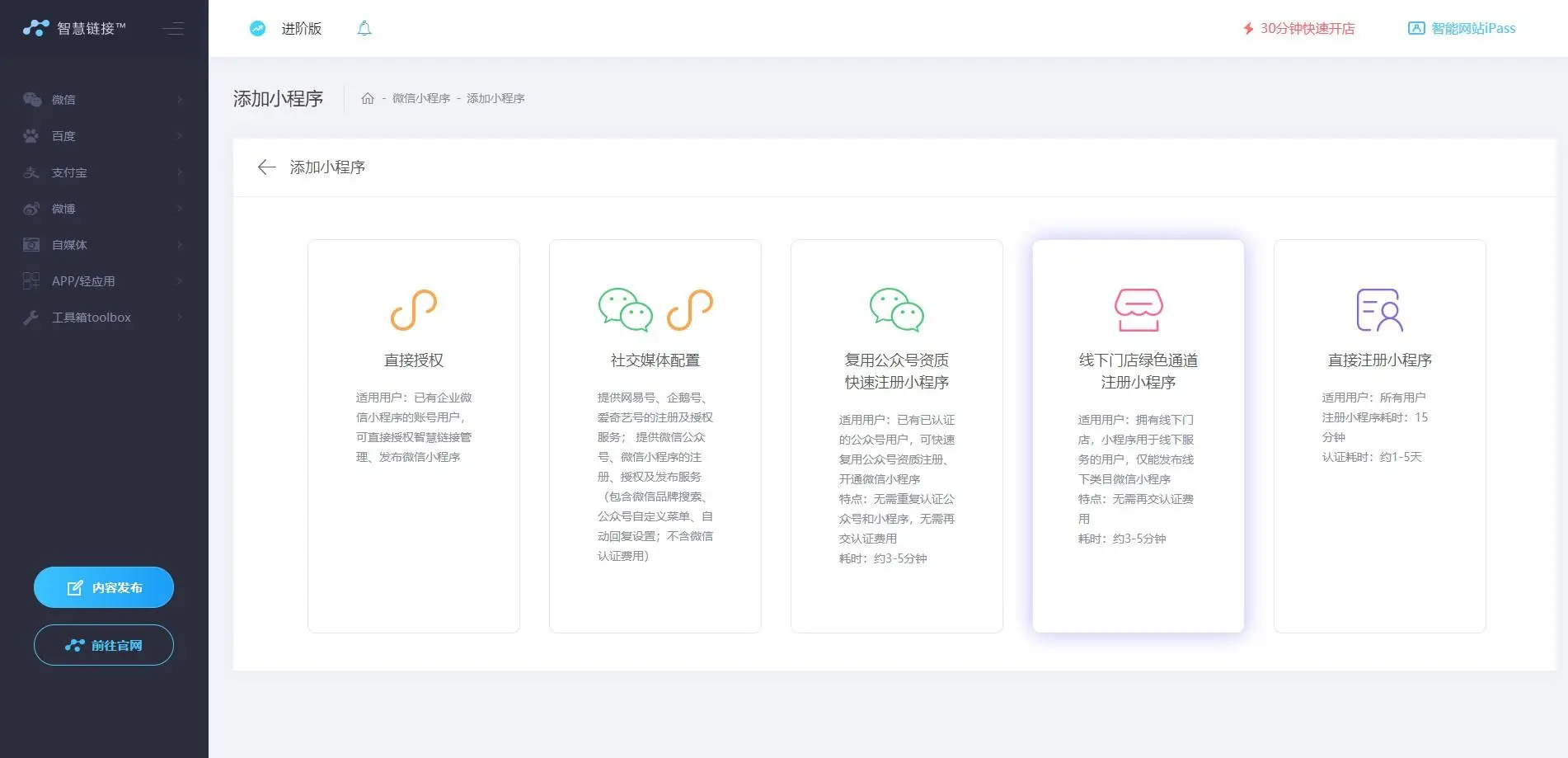 主体类型,选择个人不需要进行认证,选择“企业/组织”需要认证费。选择了“个人”搭建出来的小程序,部分功能受到限制,比如无法配置支付通道。所以,制作商城型的小程序,推荐选择“企业”类型,认证费300。 由于是自己写代码,所以时间由自己把握,比如展示型的小程序,不到半个小时就能完成;电商型的小程序会复杂一点,耗费的时间更多一点,如果还要加上一些炫酷的功能,花费的时间就继续往上叠加。 3.第三方平台开发小程序(30分钟)第三方平台的报价有点离谱, 有0元的,有几百/年的,有几千/年的,有几万/年的,报价不同,效果的区别却不大。你也应该看出来了,用第三方平台制作小程序,费用是按年交的,希望大家根据自己的预算,算清楚成本再选择。 所以建议大家选择平台存活时间长,性价比高的。 你也可以不考虑这些,选择不花一分钱制作小程序,简直就是极致性价比。 --注册小程序免去认证费进入第三方开发平台,选择“绿色通道”注册小程序。