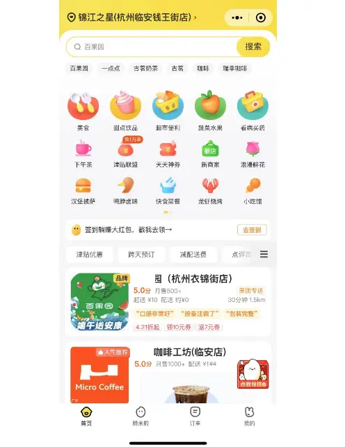 开屏弹窗,商品展示,营销活动,分享有礼,获得积分(京豆),会员优惠....购物体验良好,不需要下载APP,一个小程序足够了。 “食”-外卖,买菜,团购外卖小程序,这里随便定个位,给小程序截图,显示如下图: