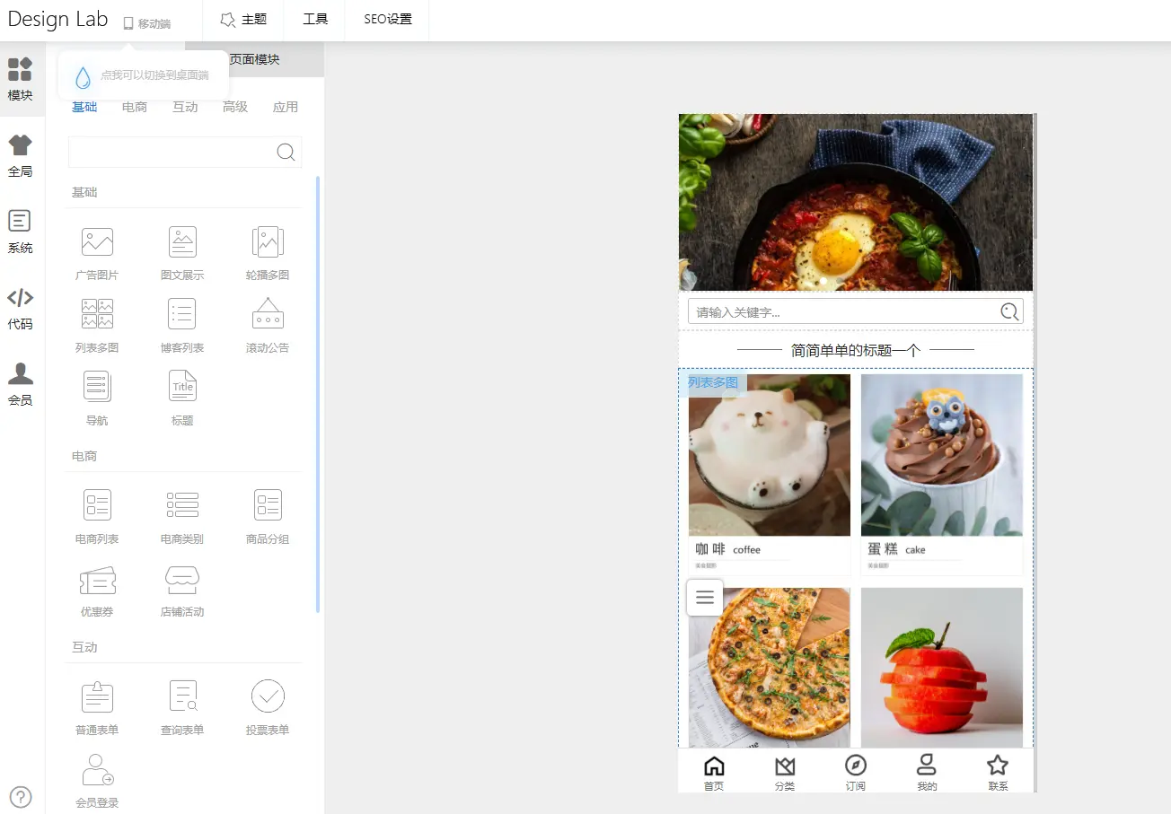 编辑页面,进入【Design Lab】,拖拽添加组件,右键编辑,设置基本参数。左侧有20多个组件,通过简单的排列组合就能制作出功能丰富的小程序。