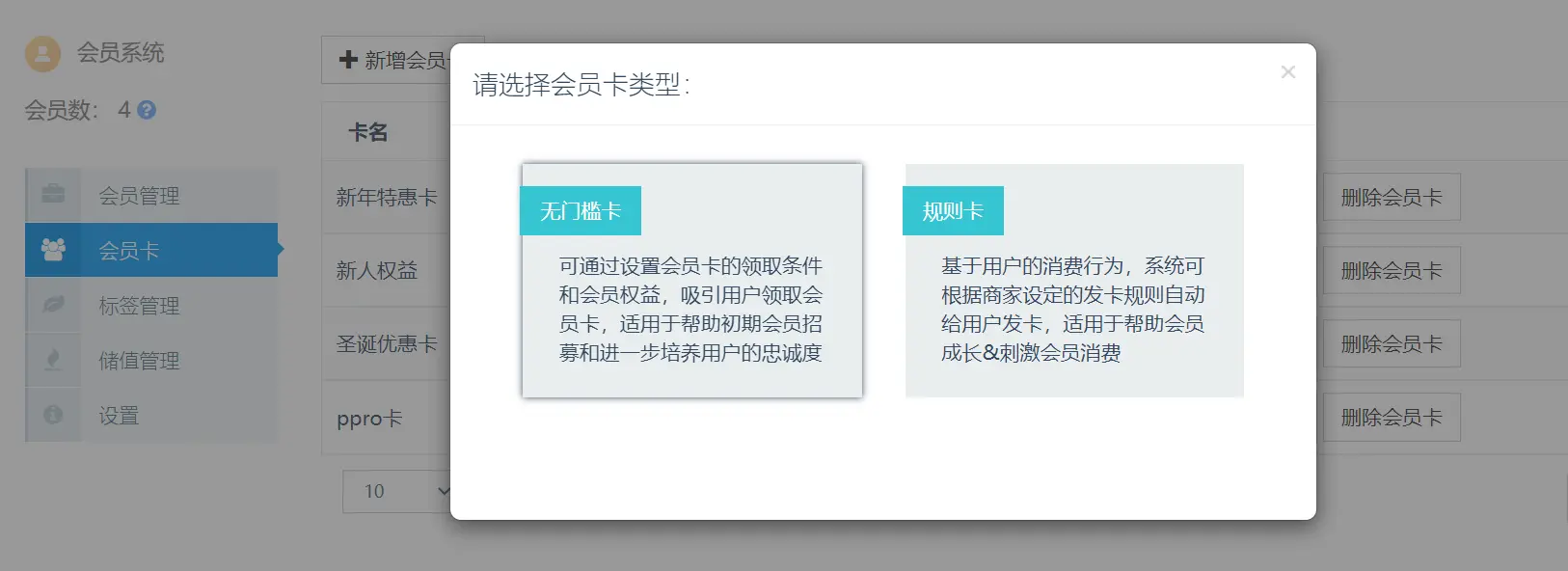 可以给会员添加不同的标签,发会员卡,管理会员储值和会员积分。 会员卡包括无门槛卡和规则卡。