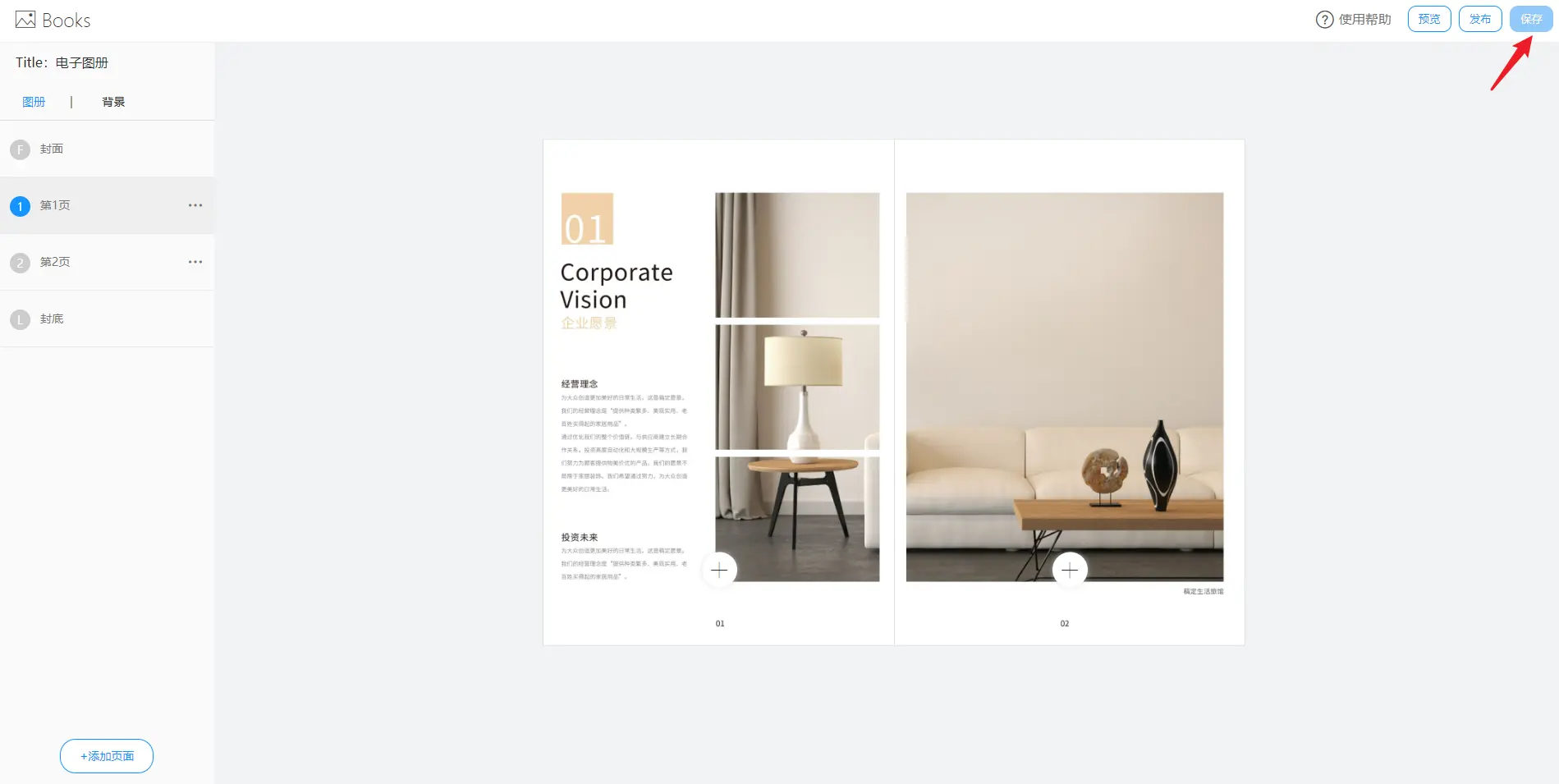 设置电子相册的封面封底,页面,支持添加新的页面进行编辑。