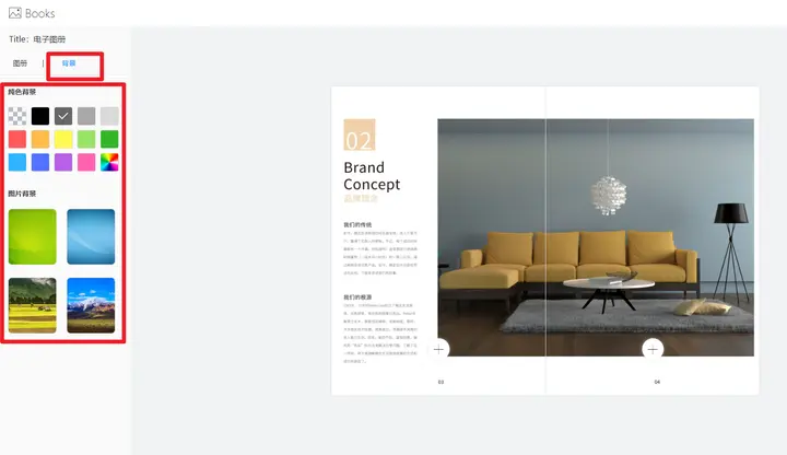 设置电子相册的背景,支持选择纯色背景和图片背景。