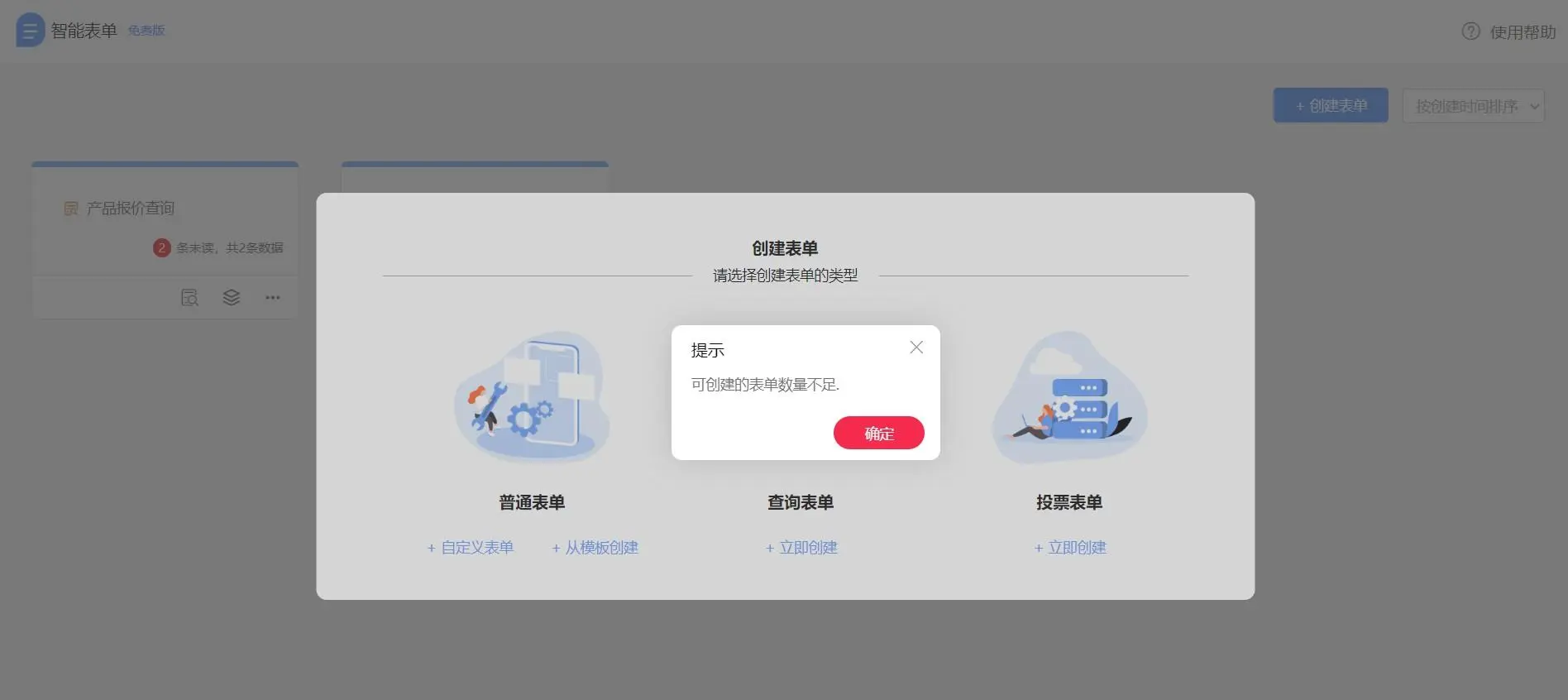 虽然免费,但是有数量限制,【智能表单】应用也是如此,可免费创建两个表单。
