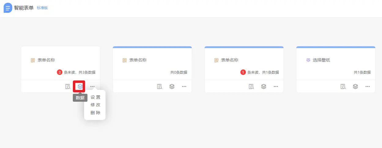 3.数据分析每个表单都以小卡片的方式展示,支持修改表单,删除表单。点击可查看表单数据,数据表格可导出进行数据分析。