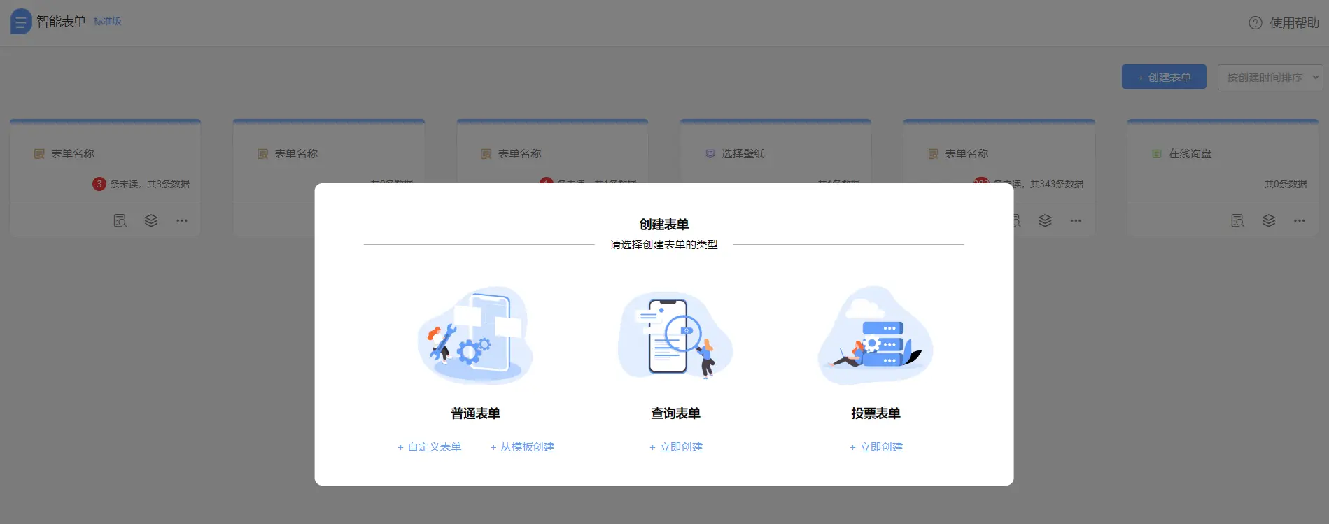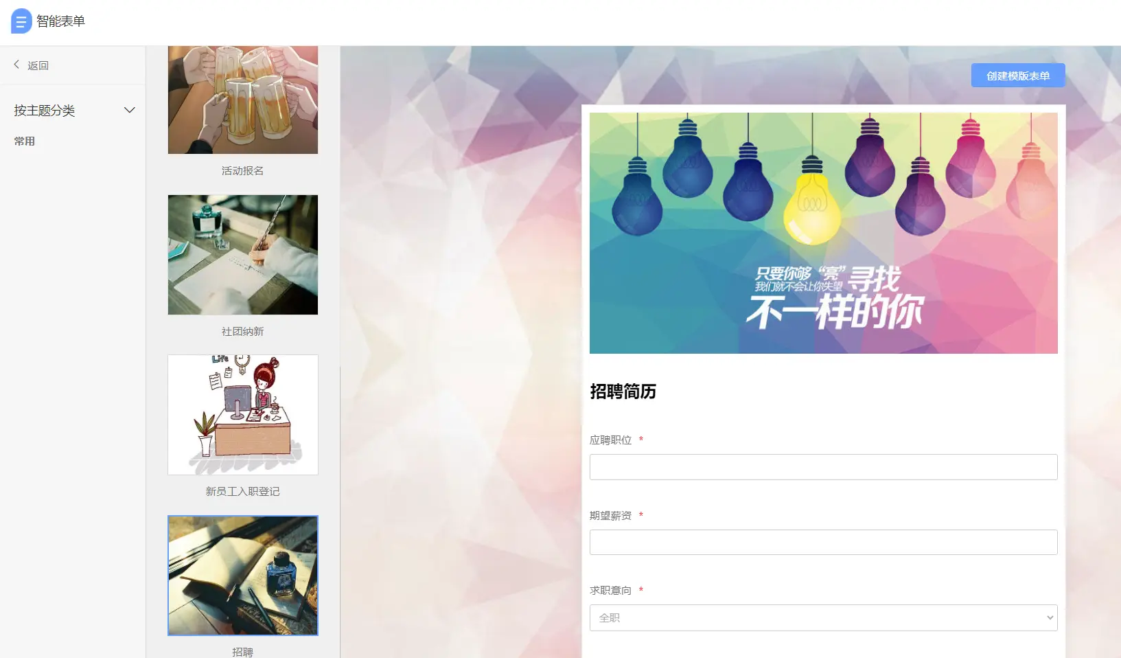 4.表单类型你理解的表单应该是收集数据的,比如市场调研,留言表单,询盘表单,招聘表单,新员工入职表单,活动报名表单..... 以上都属于普通表单,但是用第三方平台,信息流动方向变多了, 除了普通表单,还支持创建查询表单和投票表单。