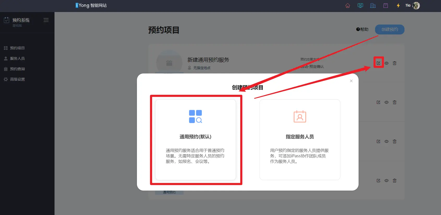 进入【预约系统】,新增通用预约(默认)项目: