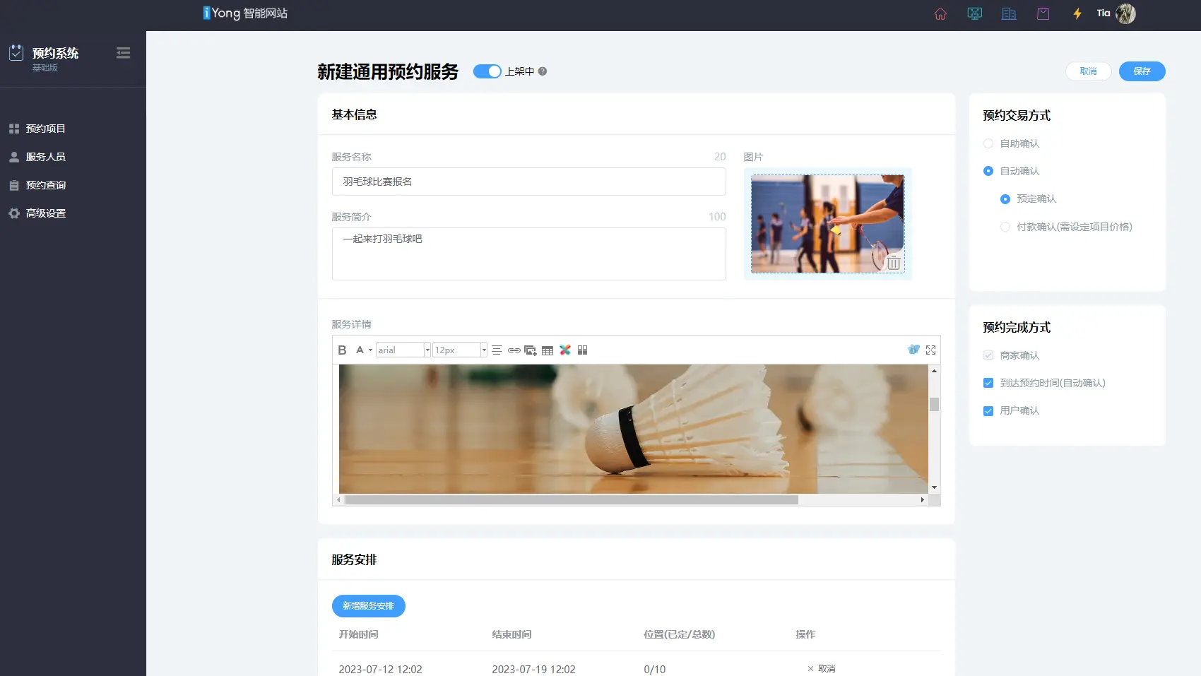 完善预约项目信息,服务名称,服务简介,服务详情,服务安排和高级设置(服务地点),可设置预约费用,也就是报名费用。