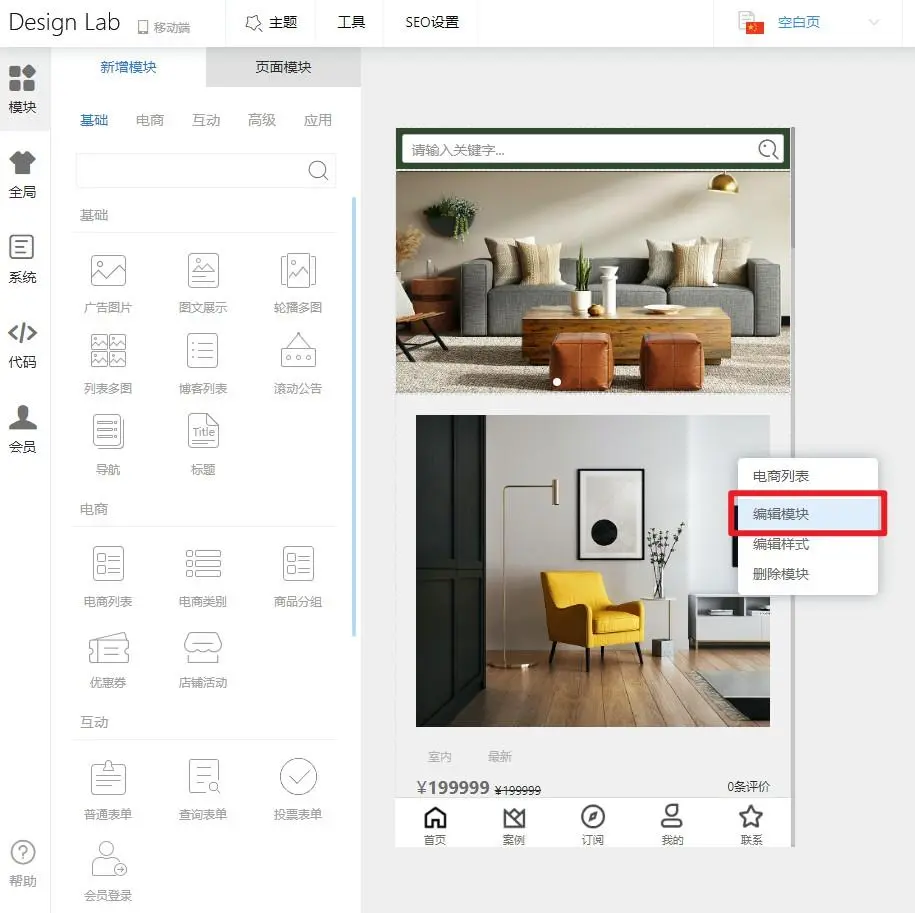除了以上这个偏促销的风格,还可以根据自己的需求将小程序设置成ins风,科技风,小清新风....轻松驾驭不同的风格,因为用第三方平台制作小程序,可以从空白页开始,尽情发挥想象,设计属于自己的小程序。 在第三方平台Design Lab编辑器中设计内容,有很多预置功能,组件都模块化了,操作步骤是从左侧拖拽组件到合适位置,右键编辑。