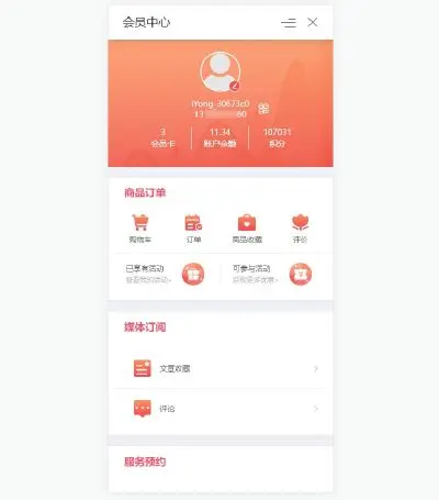 制作小程序商城,顾客登录/注册成为你的小程序会员,进入会员中心,看到的页面是这样的。这些布局,都是可以调整的,比如你想制作一个表单型的小程序,非商城型的,可以将无关的数据关闭,留下“表单系统”。