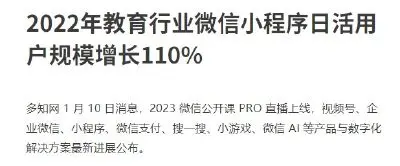举例说明:2022年教育行业微信小程序日活用户规模增长110%微信APP是一个社交APP,建立在信任基础上的交易更容易达成,所以微信小程序可以快速转化变现,而且用户粘性较强,会员制可以提升复购率。
