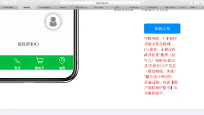 小程序审核不通过,在发布页面有红字提示审核不通过的原因,比如:“小程序功能不符合规则”,并且补充说明了不符合规则的原因。解决方法:提交【隐私保护文件】, 具体方法在轻栈社区可以找到,教程十分详细。