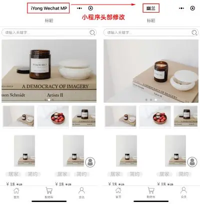 小程序首页小程序商城首页头部默认显示 「iYong Wechat MP」,想要进行修改操作步骤简单。单个页面可以分开选择分别进行设置:小程序商品详情页头部在商品详情页面的头部,默认显示商品标题。